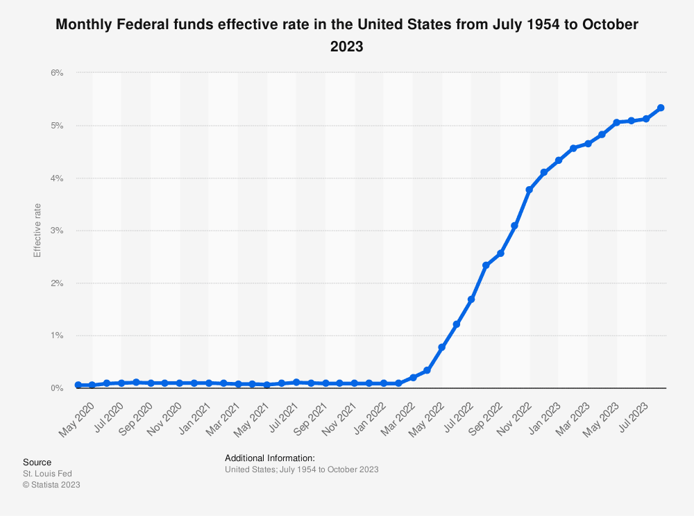Starting in May 2022, as a response to the rising inflation, the FED increased the rate 11 times between May 2022 and July 2023. As of October 2023, the rate is at a level of 5.33%.