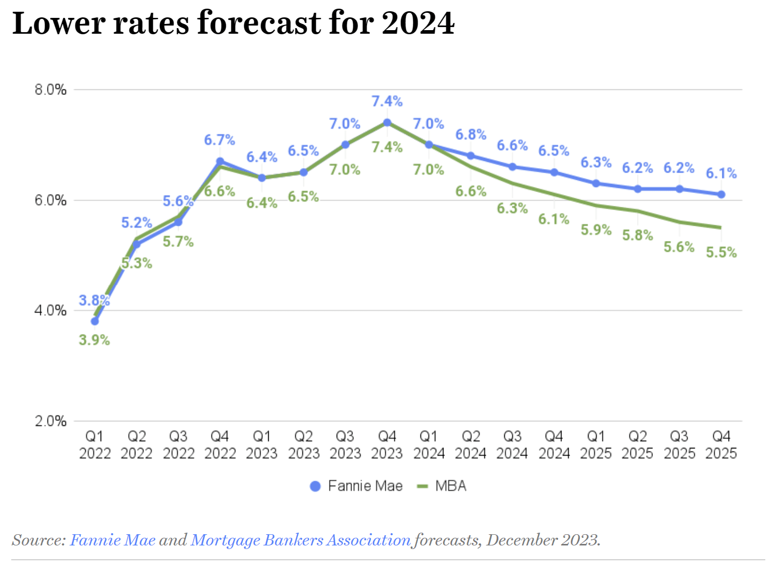Mortgage Bankers Association (MBA) and Fannie Mae economists agree (this time!) that on a national level home sales probably bottomed out in Q4 2023, and forecasters at both organizations now expect to see mortgage rates come down significantly next year re-fueling again the housing market.