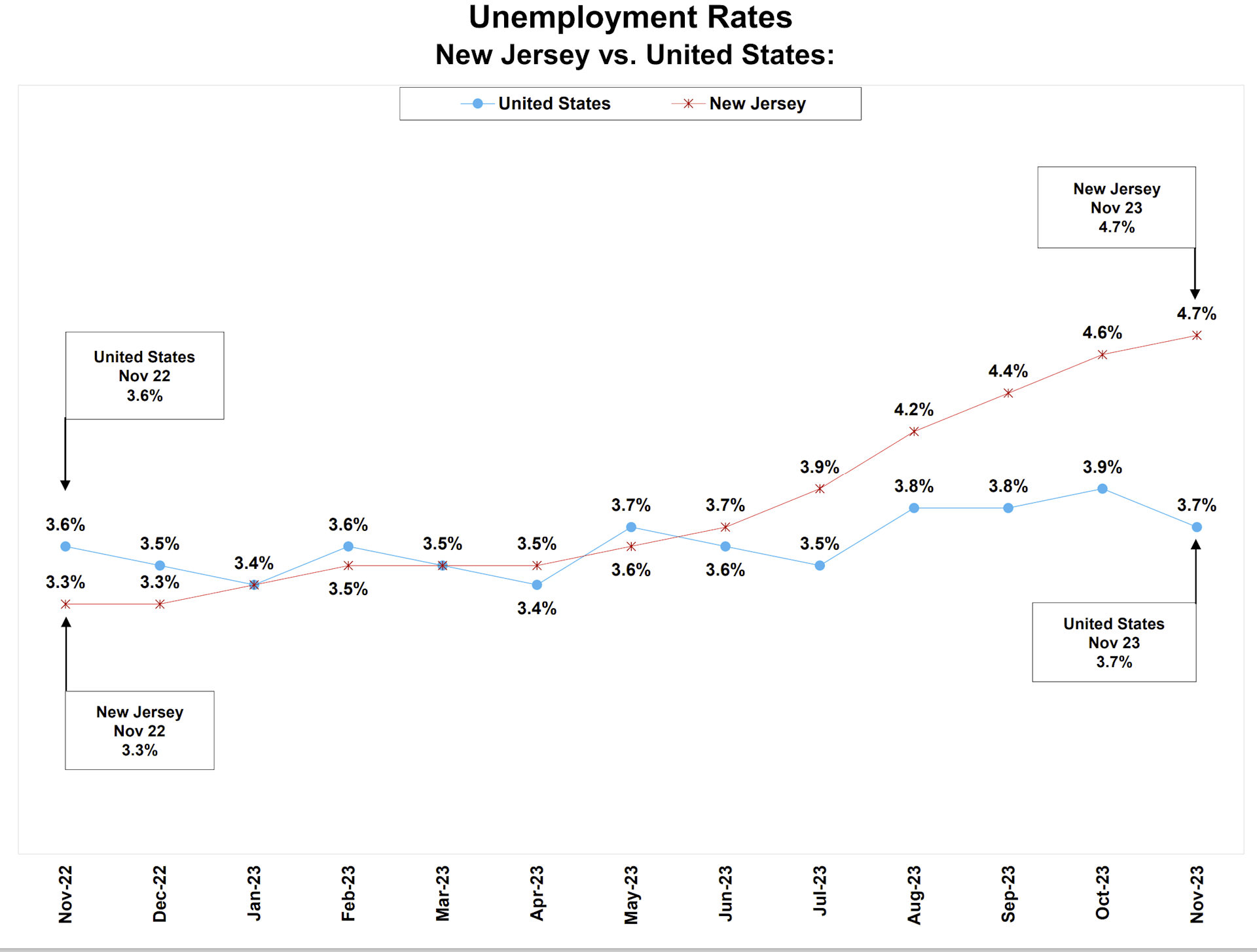 During the height of the pandemic the highest unemployment rate in the US was 8% - and in NJ it almost reached 16%. As the economy softens, NJ has now the 4th highest unemployment in the country with 4.6% compared to a national average of 3.7% in November 2023. However, this will not have an adverse effect on the housing market going forward as rate cuts and lower interest rates will stimulate the economy again in 2024.