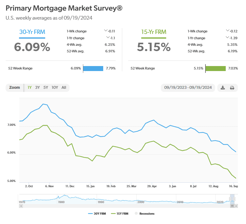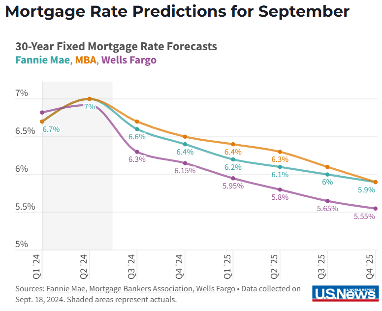Mortgage rates have already declined by over half a percentage point (0.5%) between May and September. Mortgage rates should continue declining this year as the U.S. economy weakens, inflation cools and the Federal Reserve continues to cut interest rates. The 30-year fixed mortgage rate is expected to fall to the low-6% range through the end of 2024, dipping into high-5% territory in late 2025.