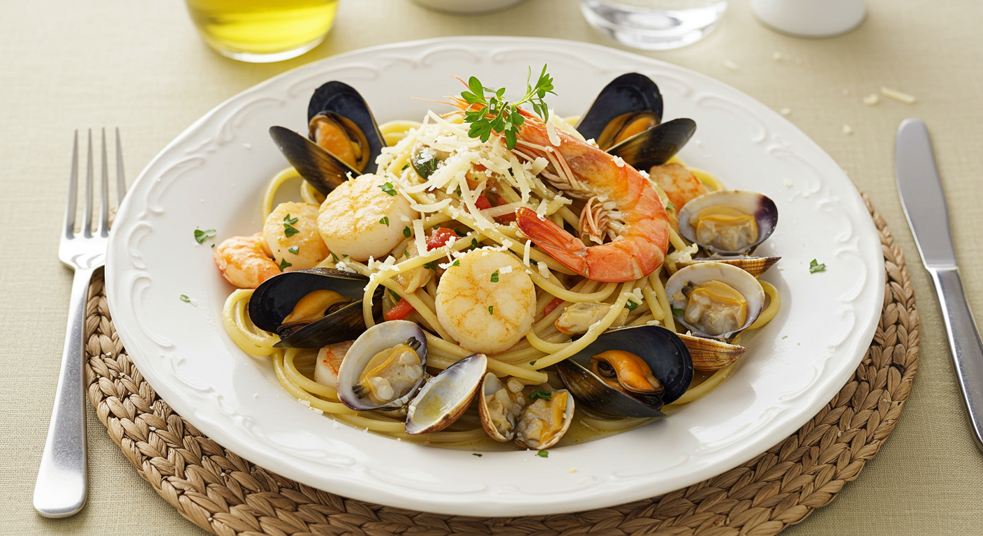 Toss lobster, scallops and squid into pan and season with old bay seasoning, salt and pepper and lemon juice and cook until seafood is cooked.