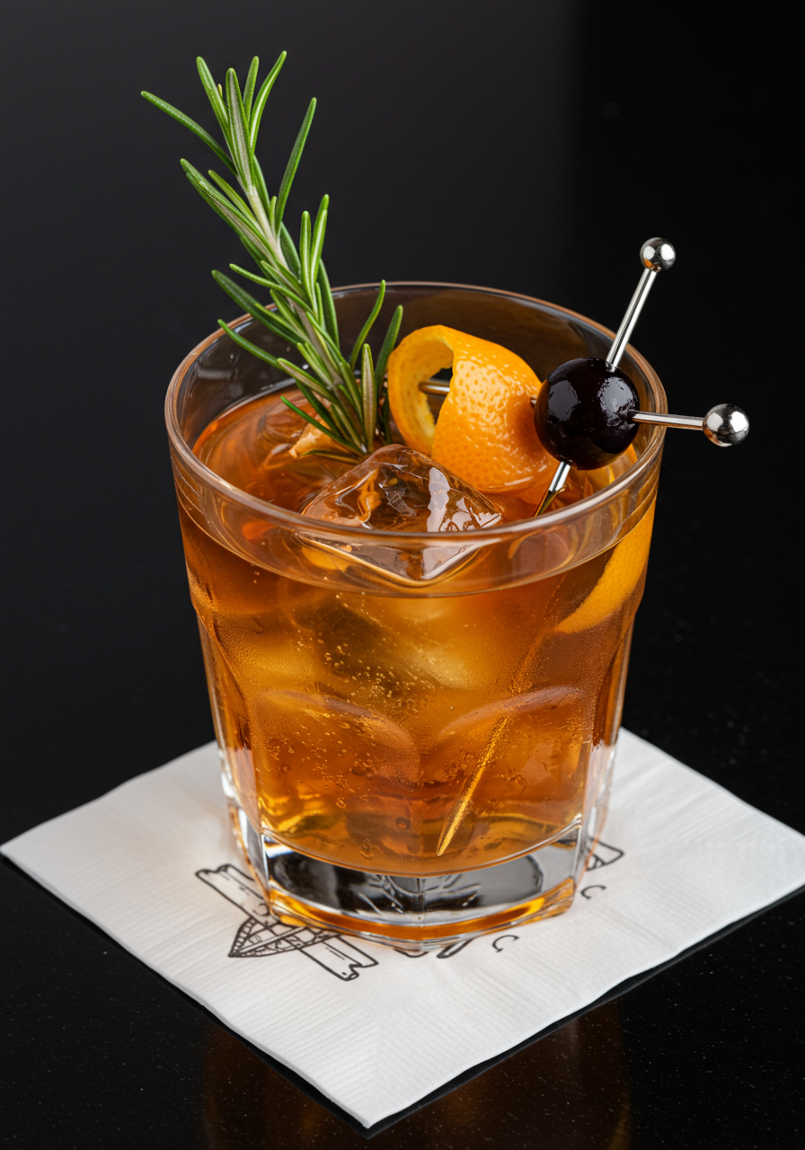 Garnish of an Orange Peel, Amaretto Cherry & Rosemary Sprig
