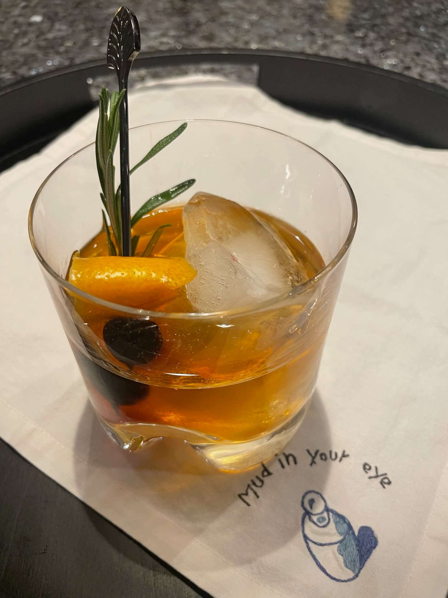 Garnish with the orange peel, an amaretto cherry & sprig of rosemary.